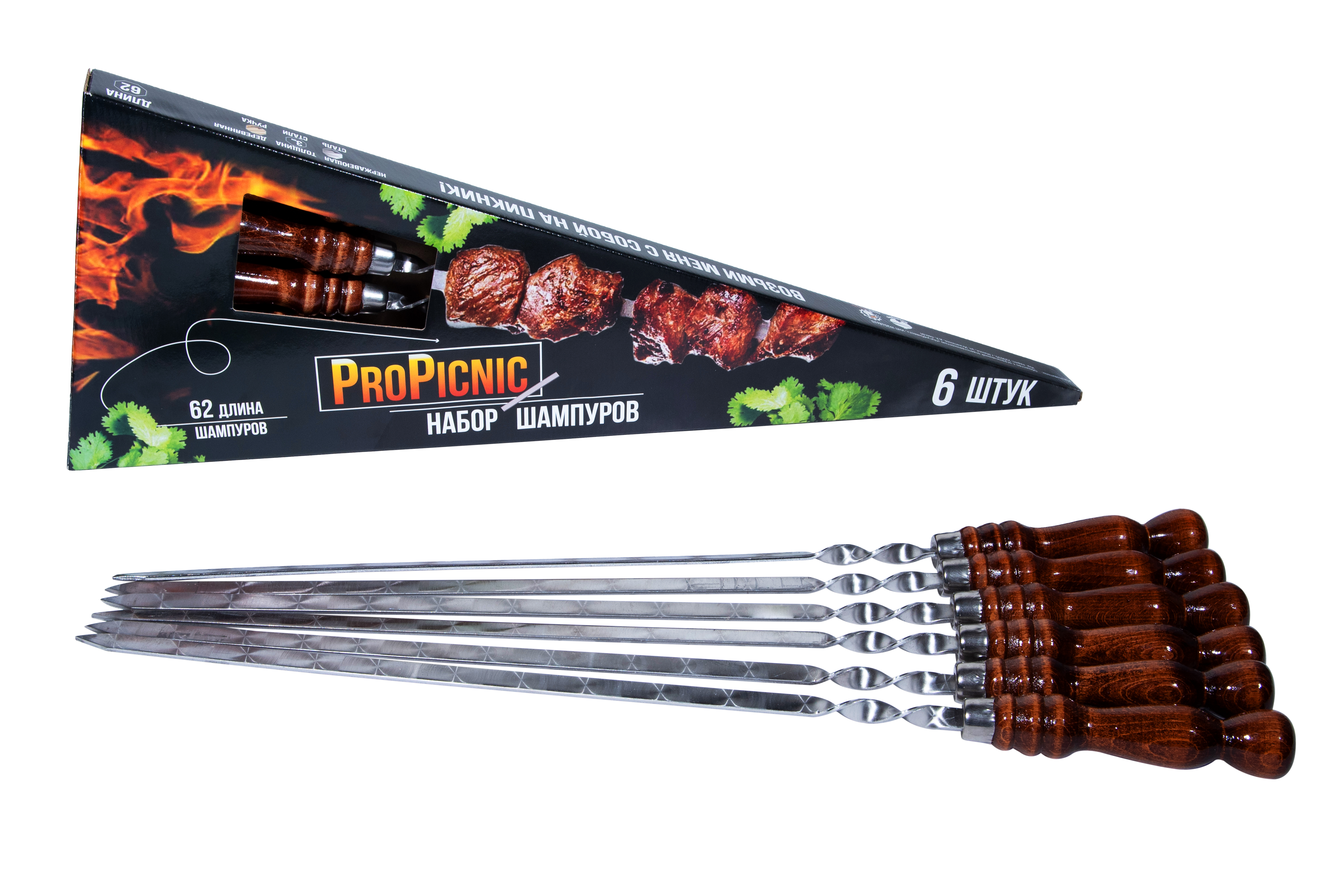 - 6 шампуров из нержавеющей стали: Шампуры длиной 40 см и общей длиной 62 см, с деревянными ручками, идеально подходят для приготовления различных блюд на мангале — от классического шашлыка до люля на шампурах или картошки на мангале.
