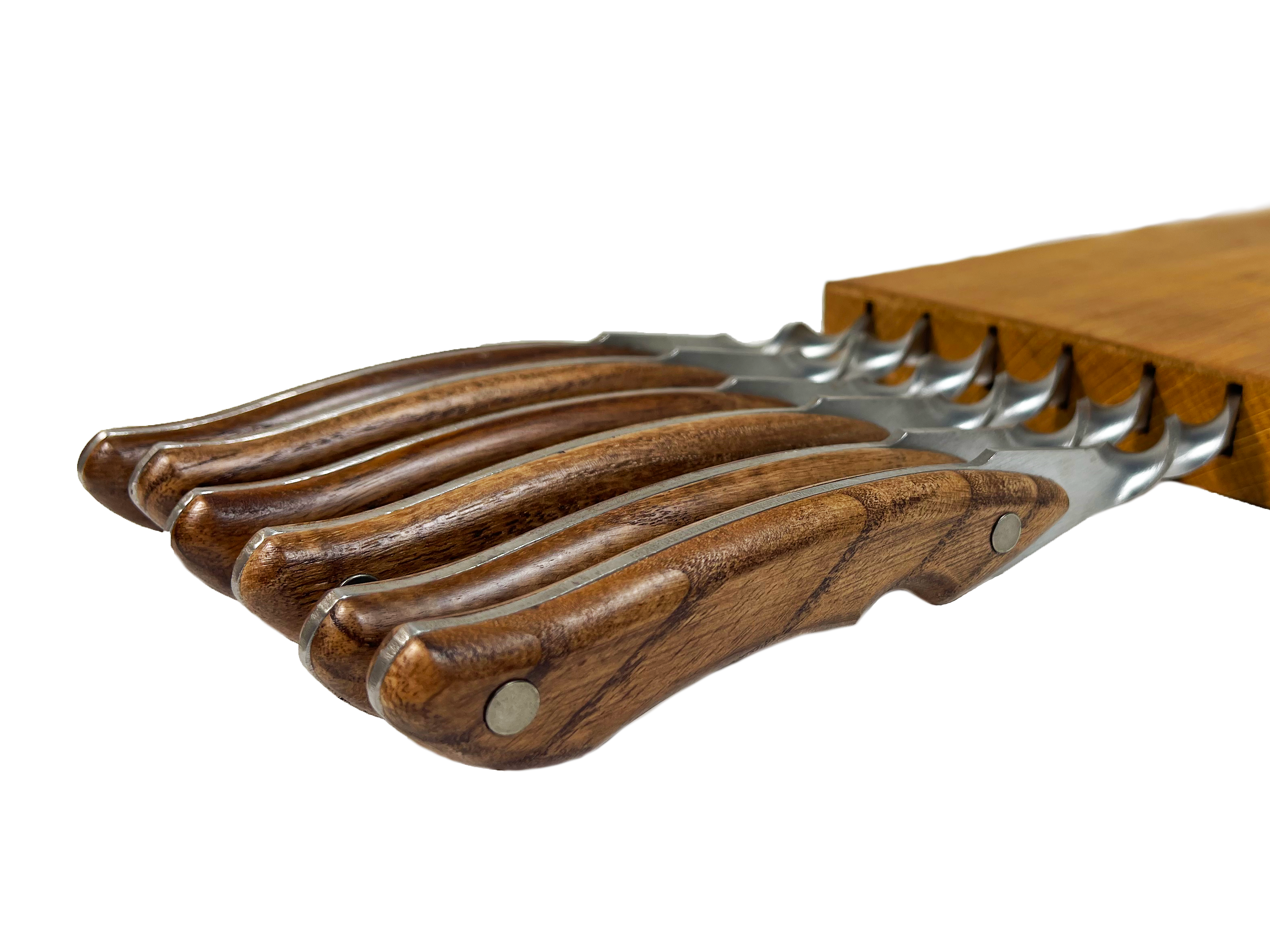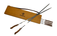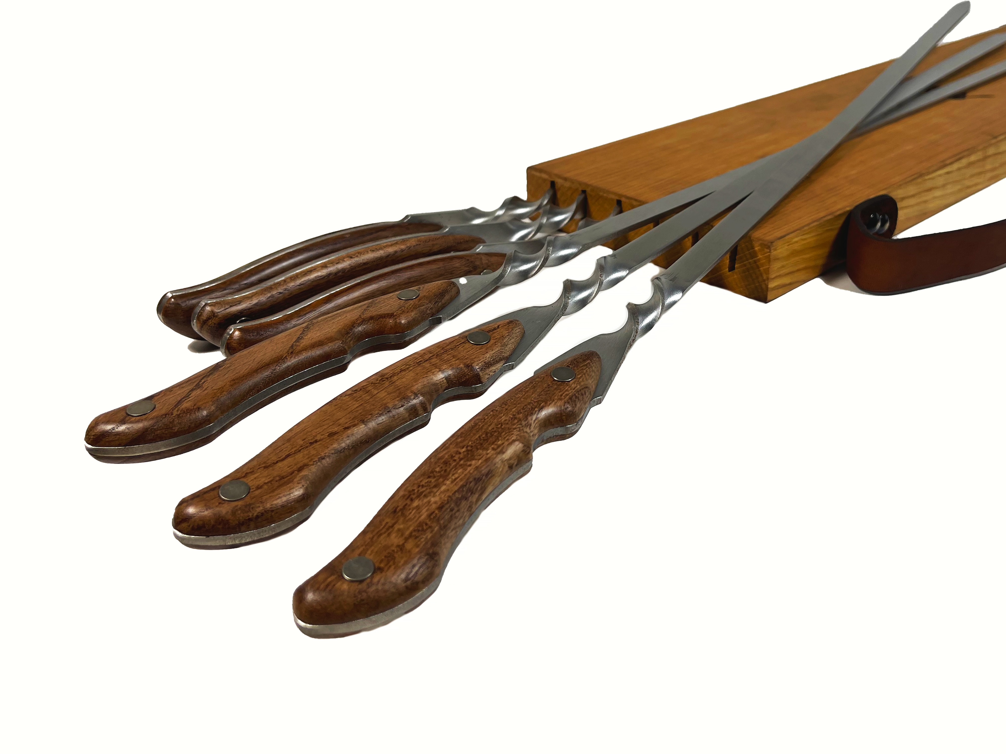 - 6 шампуров с деревянными ручками из ясени: Шампуры изготовлены из прочной нержавеющей стали, которая гарантирует долговечность и надежность. Ручки из ясеня, тщательно обработанные вручную, гарантируют удобный и надежный хват, придавая каждому шампуру особое изящество.