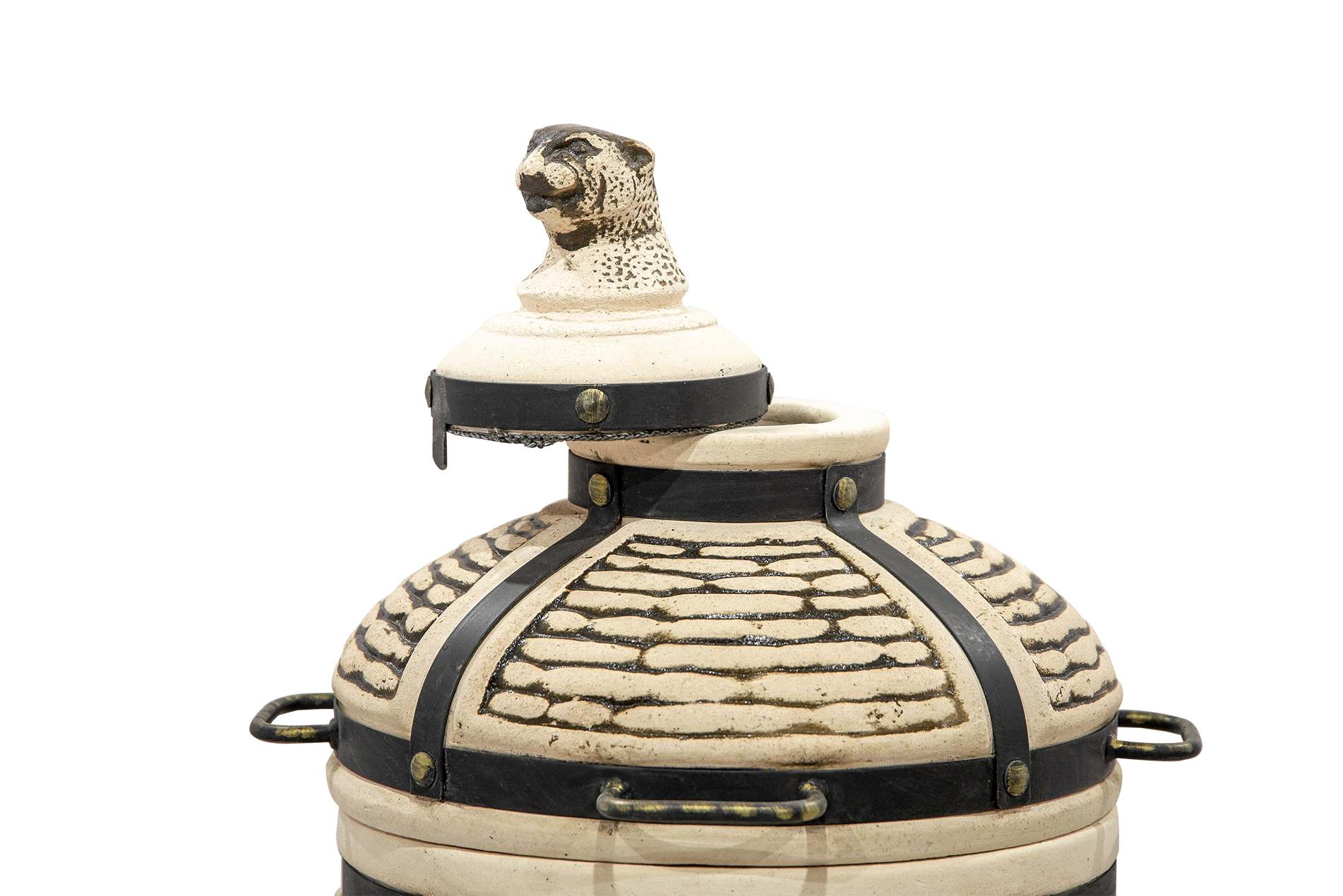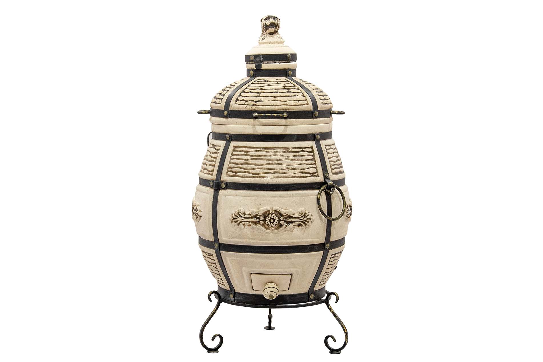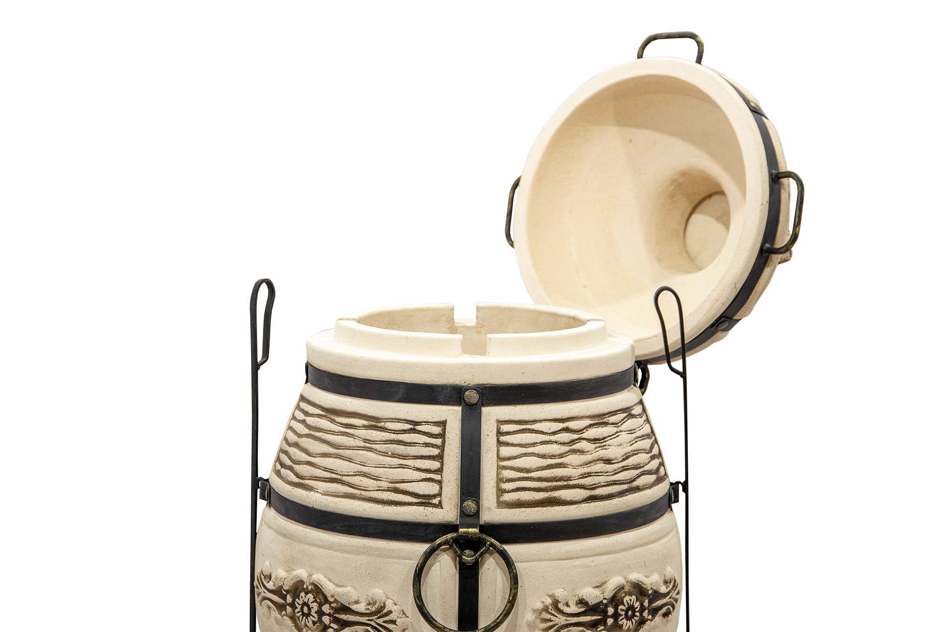 Тандыр Барс имеет традиционную округлую форму с крышками двух уровней: колпачок и основную крышку. Такой конструктив позволяет эффективно сохранять тепло при приготовлении. Удобные ручки на крышке помогают быстро открывать тандыр для закладки продуктов. Прочная кованая подставка с устойчивыми ножками делает использование тандыра на любой поверхности безопасным, а также защищает дно тандыр от излишней влаги от земли.