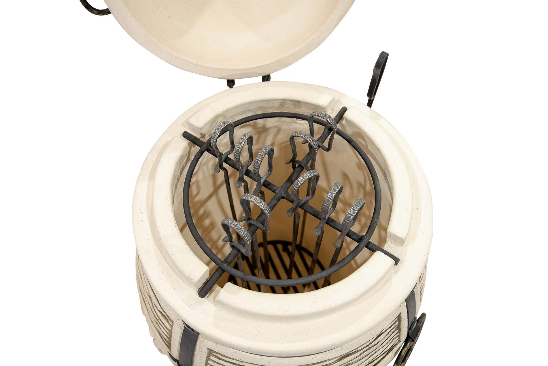 тандыр в сборе (1 шт.), шампуры из нержавеющей стали (10 шт.) , кочерга (1 шт.), совок (1 шт.), зольная решетка (1 шт.), устройство для подвешивания (1 шт.), кованая подставка (1 шт.) |
