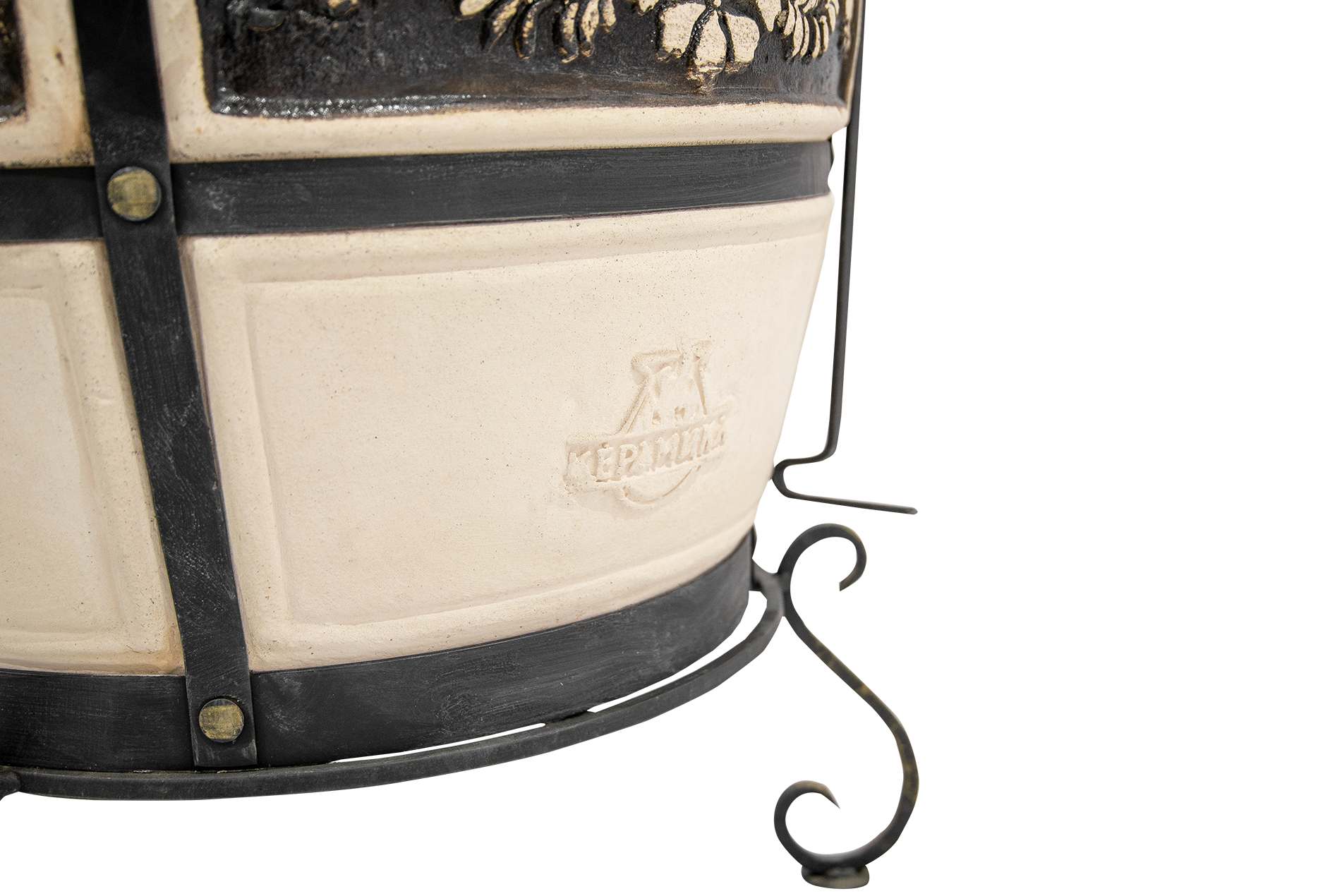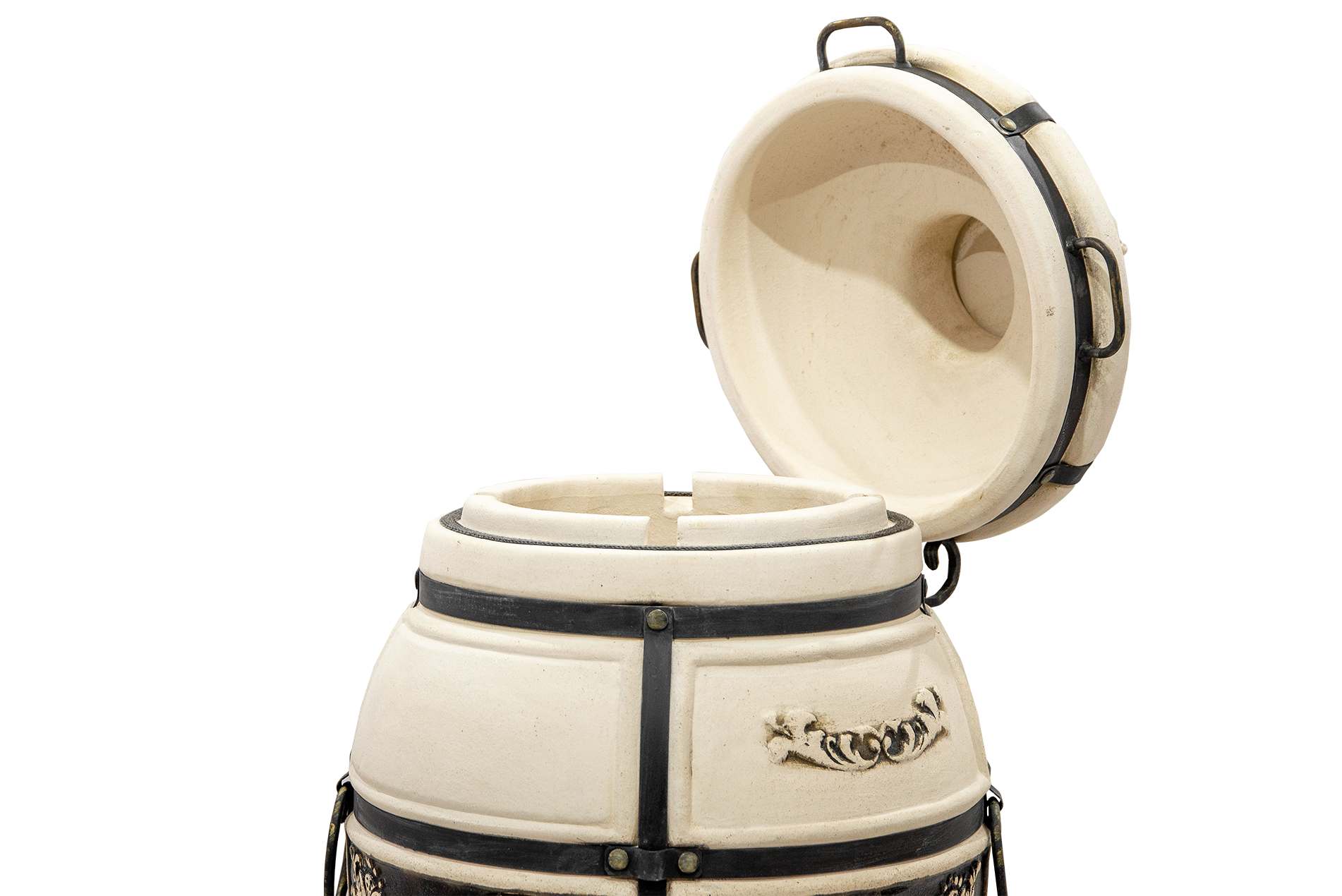Эстетичный внешний вид тандыра Казачий украшен оригинальными орнаментальными узорами в бежево-коричневых тонах. На центральной части корпуса расположен декоративный элемент в виде растительного узора, выполненного с вниманием к деталям. Глазурь на орнаментах защищает поверхность от влаги и грязи, обеспечивая долговечность и эстетичный внешний вид. Шамотная глина, использованная в производстве, выдерживает высокие температуры и обеспечивает идеальные условия для готовки.
