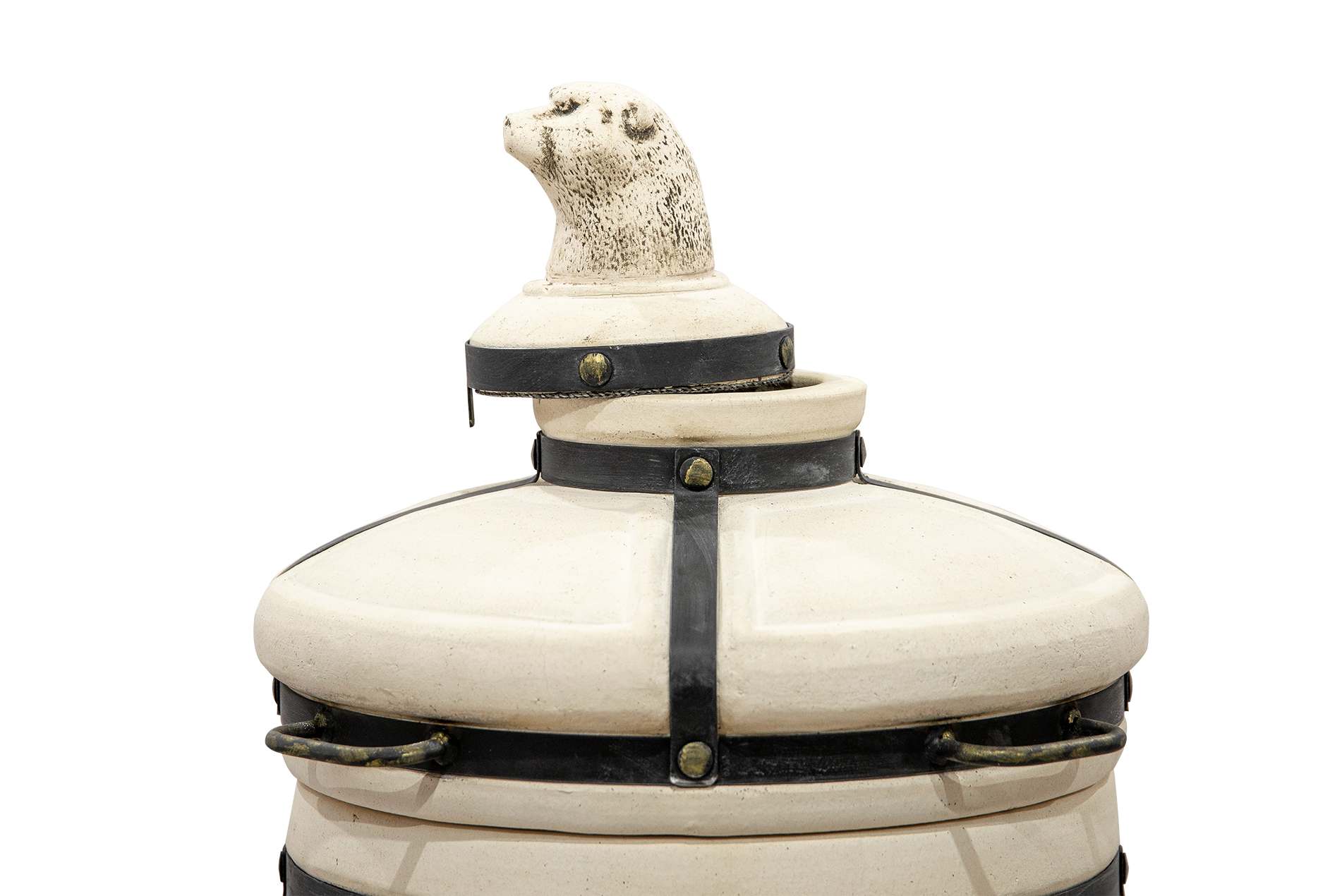 Тандыр Казачий выполнен в виде массивного бочонка с плавными линиями и имеет крышки двух уровней. Верхняя крышка-колпачок помогает удерживать тепло при открывании тандыра, а основная откидная крышка с удобными ручками облегчает доступ к продуктам. Массивная кованая подставка обеспечивает устойчивость и безопасность в использовании, что особенно важно при приготовлении на открытом воздухе.