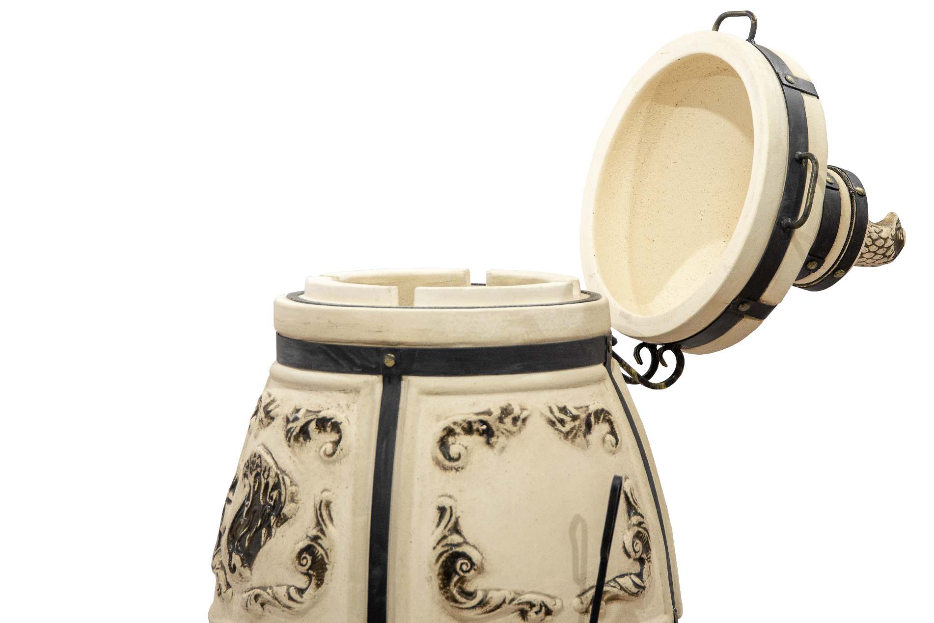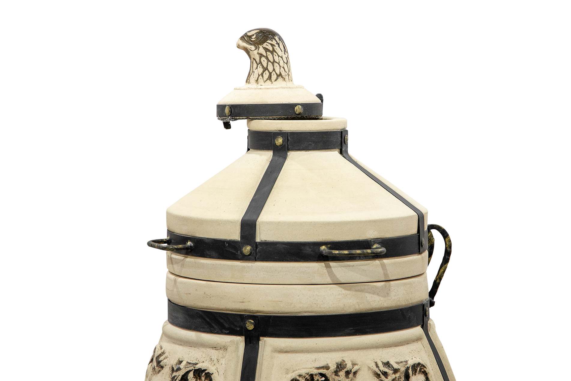 Тандыр Степной выполнен в форме классического глиняного горшка, слегка суженного к горловине. Уникальная деталь этого тандыра — декоративный колпачок в виде головы степного орла, символизирующего силу и свободу. Он не только придаёт тандыру особый шарм, но и помогает сохранять тепло при открывании. Основная откидная крышка с удобными ручками облегчает доступ к продуктам. Кованая подставка-ножки гарантирует устойчивость и удобство в использовании, а также не даст лишний влаге повредить дно тандыра.