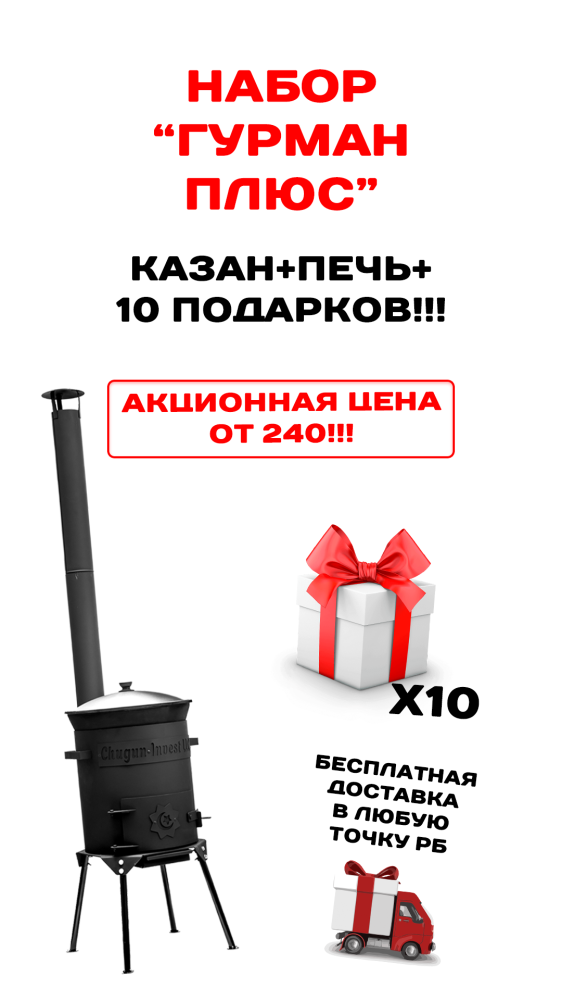 Приобретайте комплект казан с печкой Гурман, экономьте до 30% от стоимости комплектующих набора и готовьте любимые блюда в казане и коптильни в одном месте.