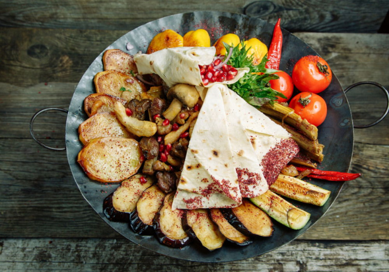 - Лаваш. Из муки, дрожжей, воды и соли замешивают мягкое, упругое тесто. Раскатывают шарики и выпекают на садже тонкий лаваш.