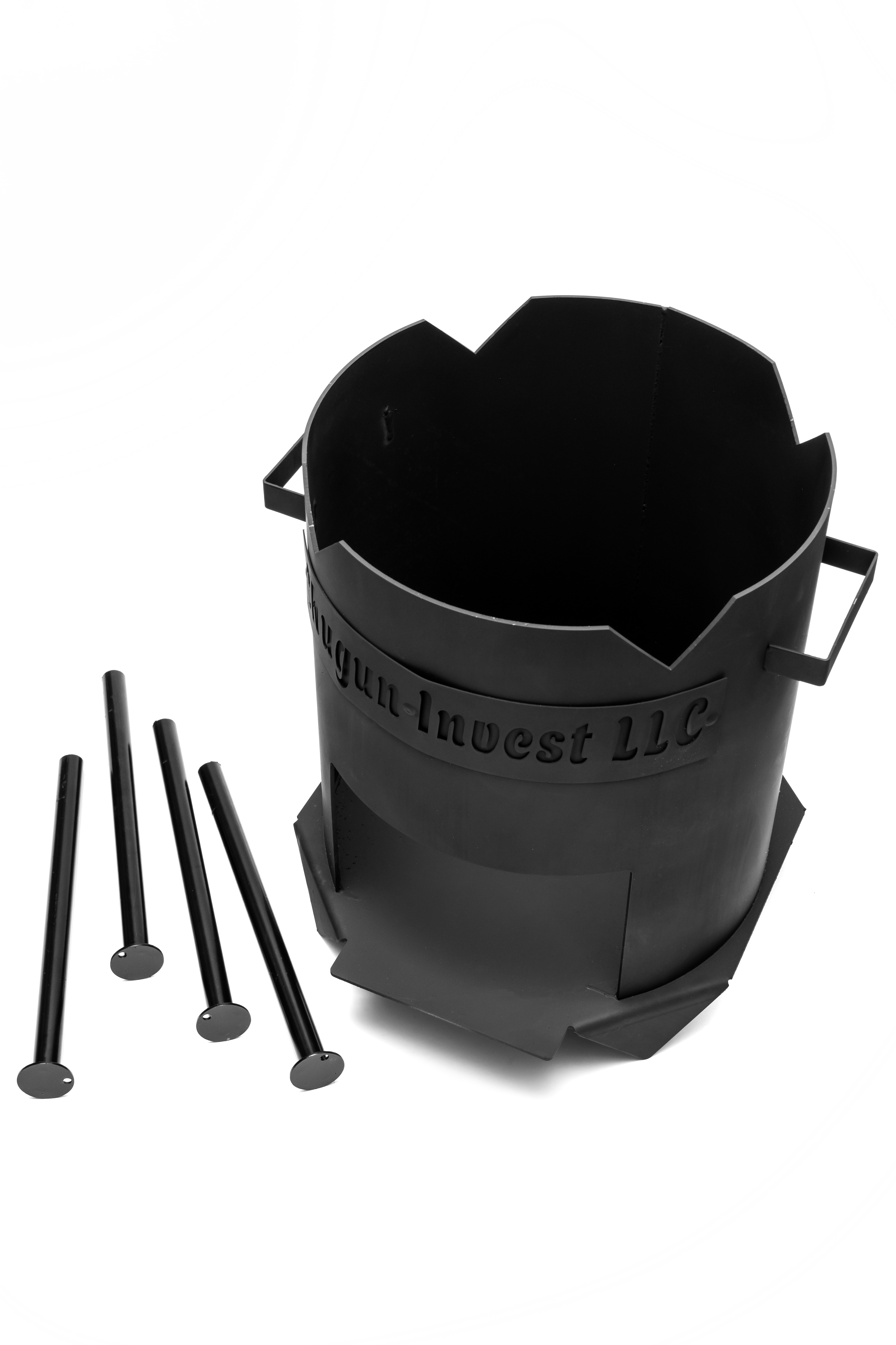 Разборная, удобная и качественная металлическая печь со съемным ножками под казан объемом 16 литров. Данная печь позволит Вам удобно расположить казан прямо над источником огня, и существенно упростит приготовление пищи в казане. Также печка для казана существенно сэкономит затраты дров во время подогрева чугунного казана.