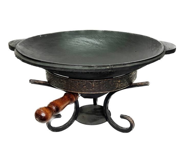 1. Универсальность. Внешний вид саджа напоминает сковороду с вогнутой поверхностью. Её можно использовать для приготовления мяса и овощей, а также подавать на ней горячие блюда. Обратная же сторона посуды может использоваться для выпекания лепешек или лавашей.