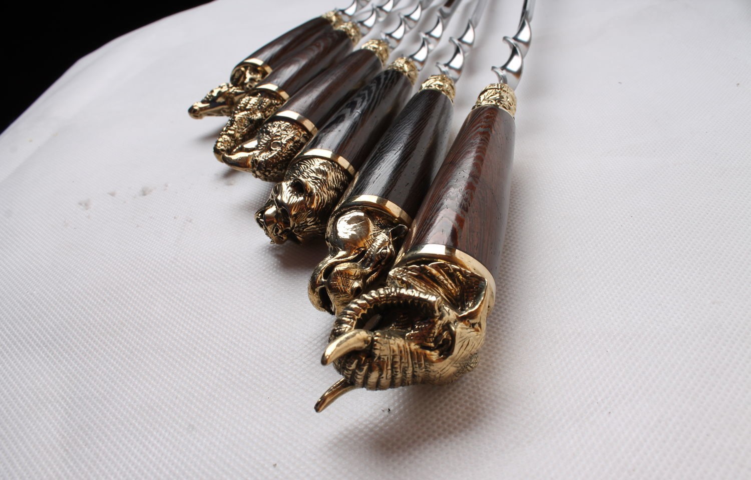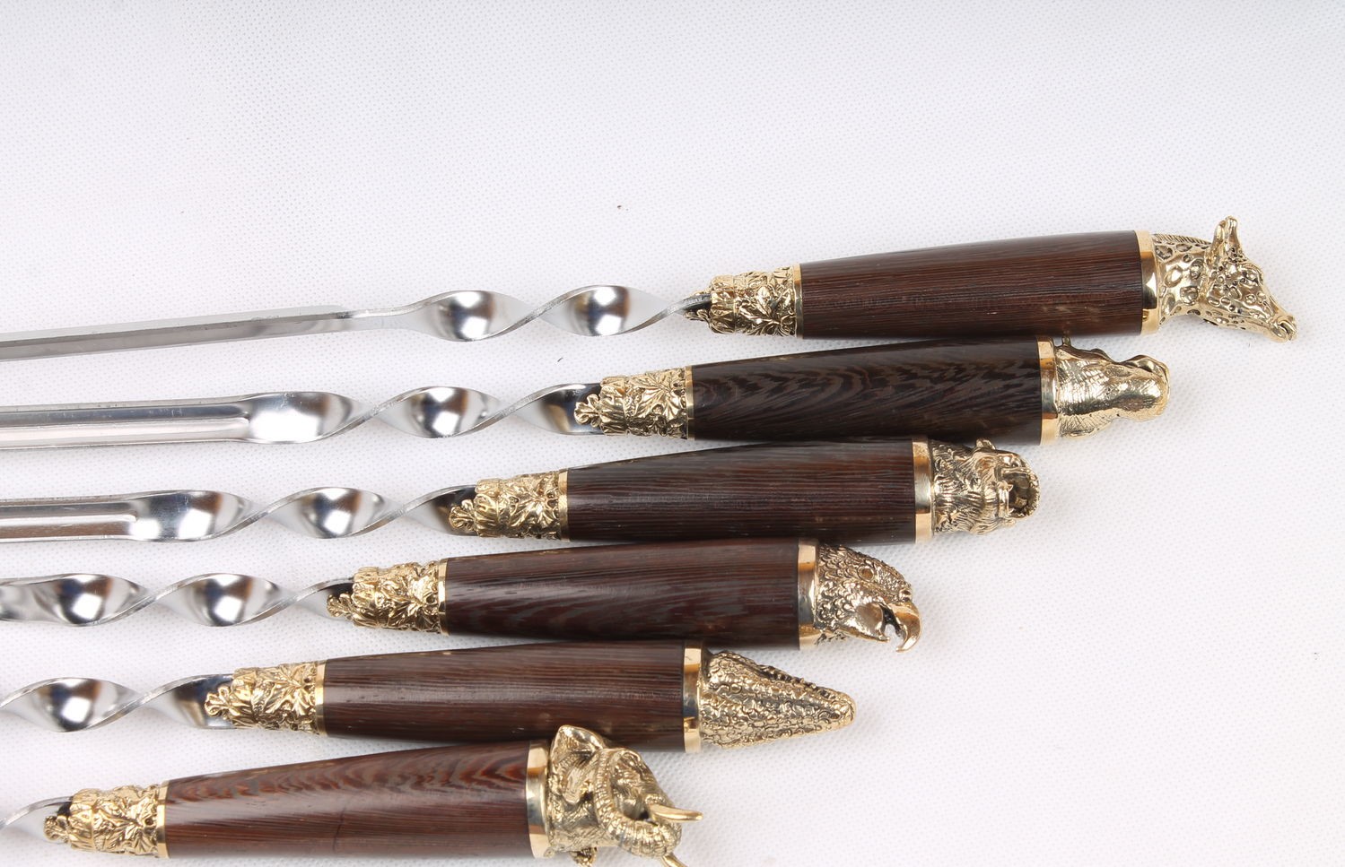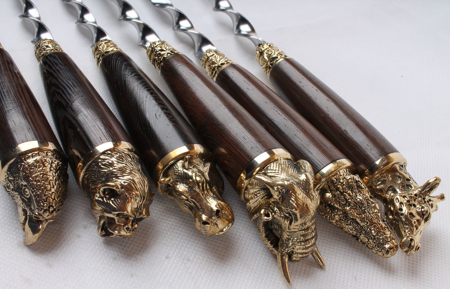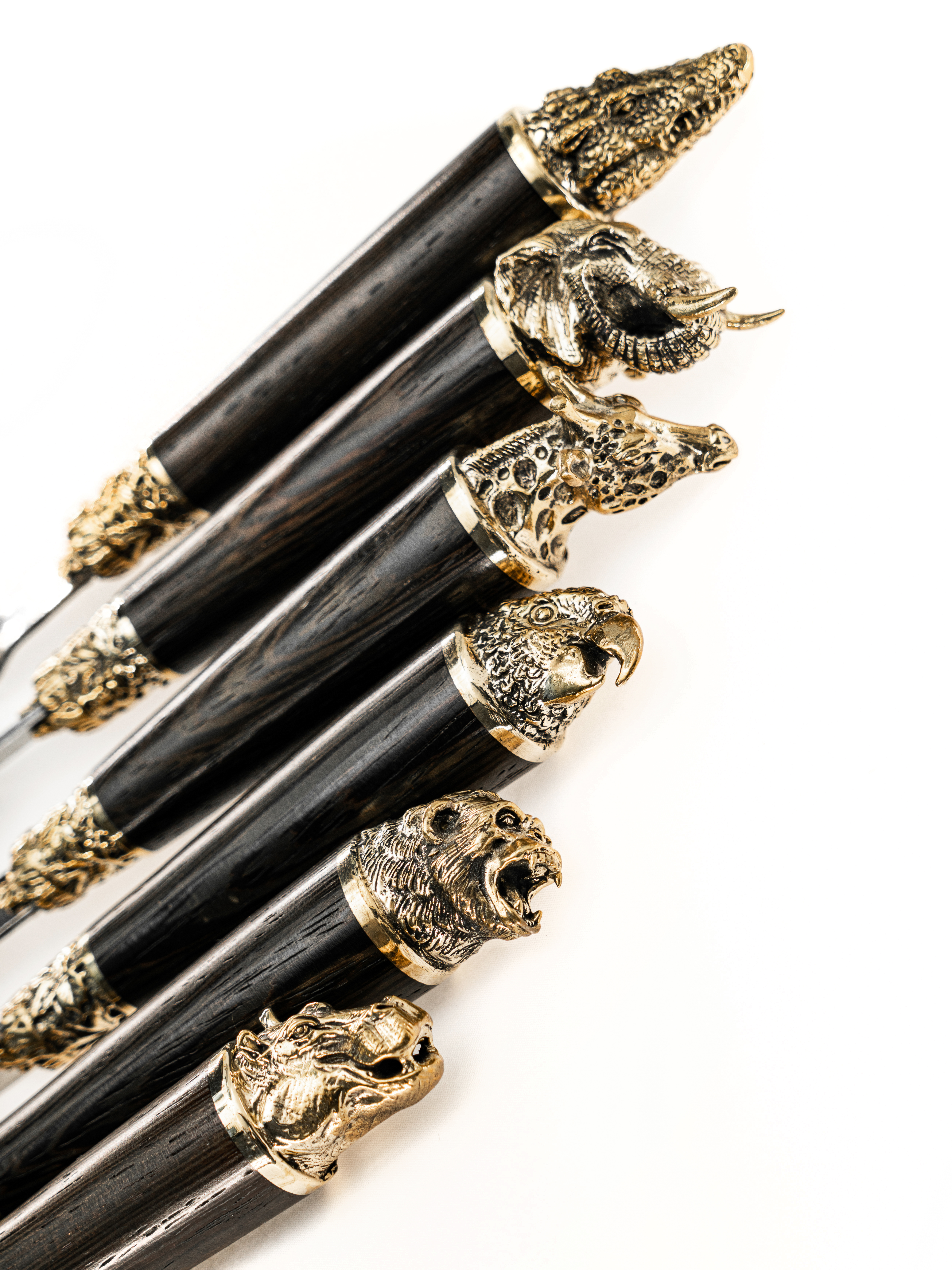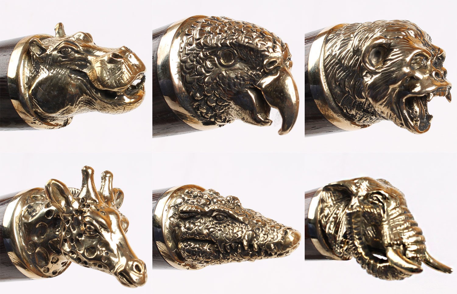 Литье рукоятки: полностью деревянная рукоять с латунным наконечником изображающим диких зверей