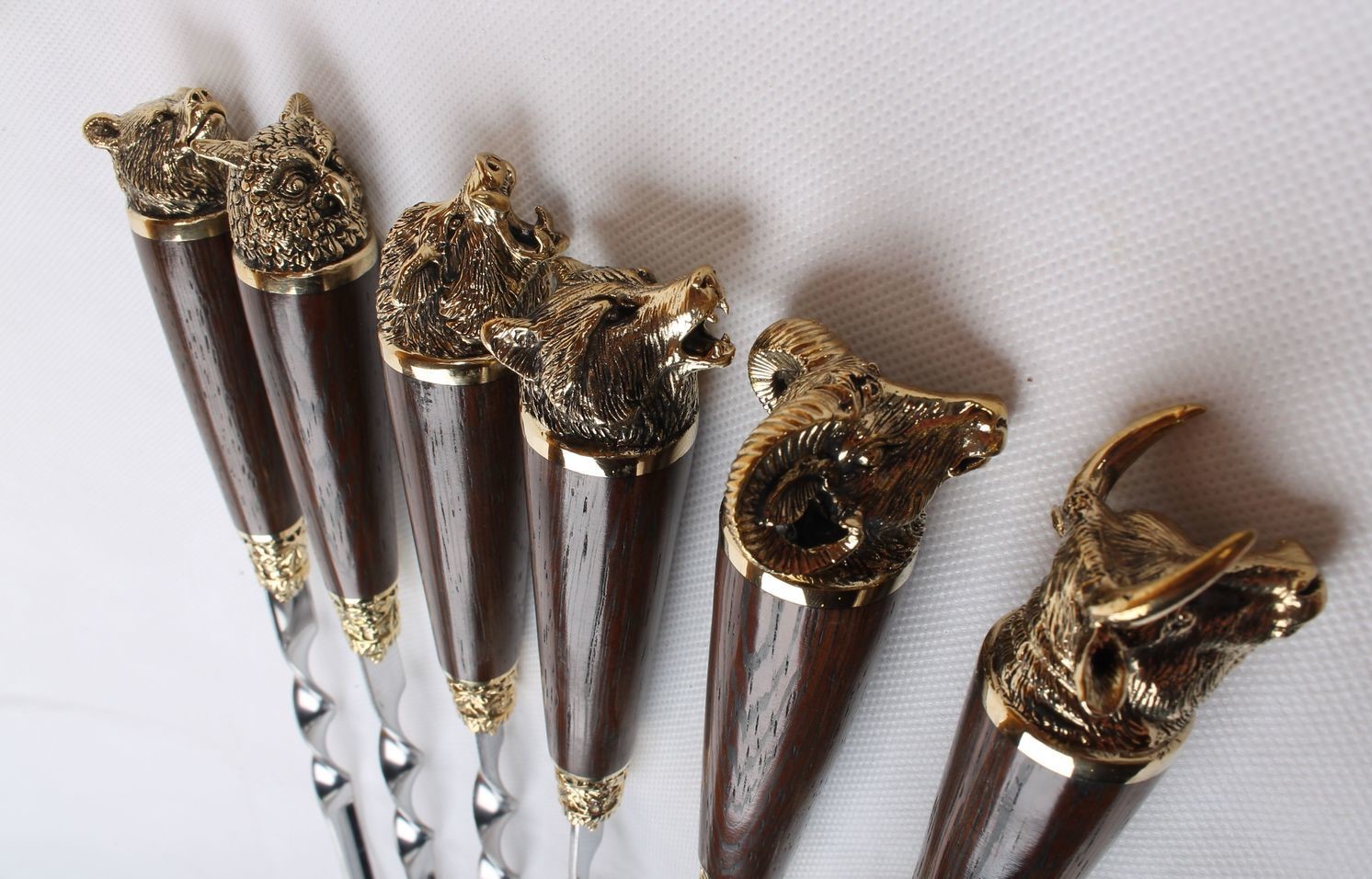 Литье рукоятки: полностью деревянная рукоять с латунным наконечником изображающим диких зверей