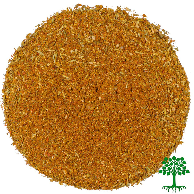 Состав: паприка молотая, кориандр, смесь "Лимонный Перец", смесь "Хмели-сунели", розмарин, фенхель, орегано, куркума, тимьян, кунжут белый, смесь "Карри нежная", сумах, майоран, перец чёрный, имбирь