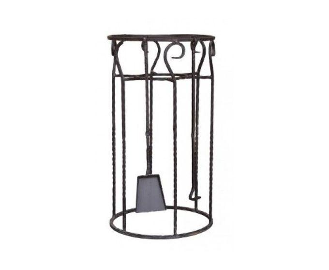 Подставка минималистичная, она выполнена из кованых элементов методом сварки. Ковка значительно усиливает металл, придавая ему дополнительную прочность и устойчивость к нагрузкам. Приспособление имеет простую цилиндрическую форму и не занимает много места.