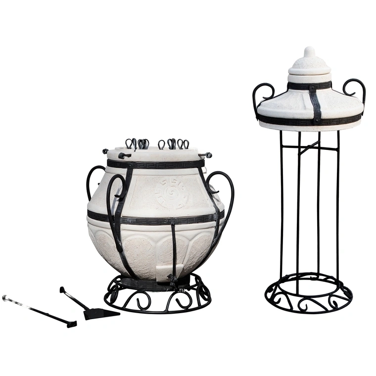 тандыр в сборе (1 шт.), кочерга (1 шт.), совок (1 шт.), стойка-подставка под крышку (1 шт.), приспособление для подвешивания шампуров (1 шт.), подставка под тандыр (1 шт.) |