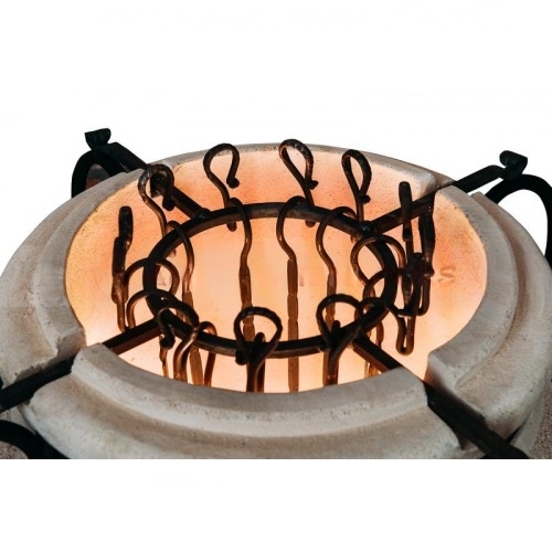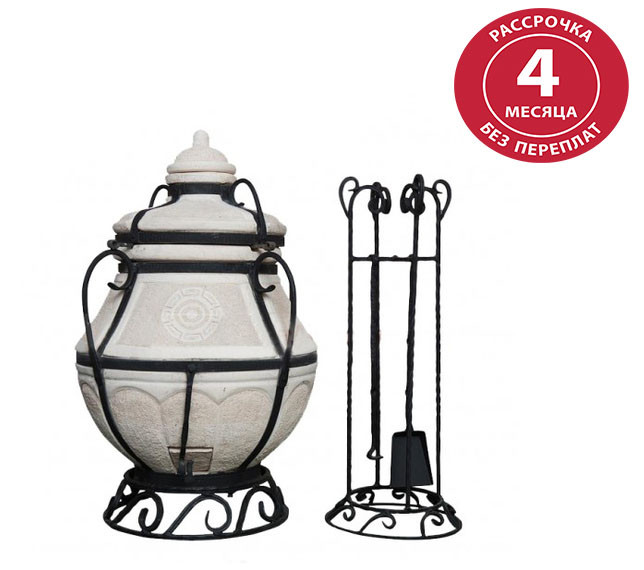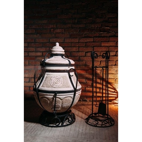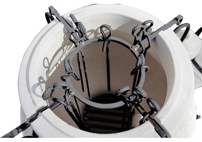 Для большей устойчивости модели и ее легкого перемещения предусмотрена кованая подставка с ручками. Прочная сталь легко выдерживает нагрузки, а благодаря изящному воплощению, подставка смотрится красиво и дополняет облик печи. За счет ручек переносной тандыр «Алладин мини» проще перемещать – идеальный дачный вариант.