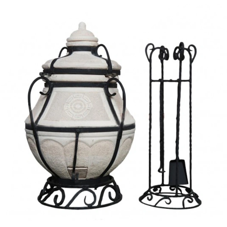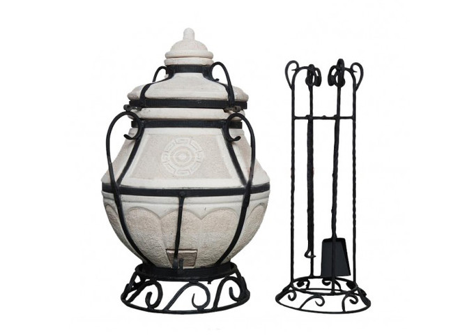 Для удобства использования к печи прилагается отдельная стойка для крышки и аксессуаров, шампуры, приспособление для их подвешивания, кочерга и совок.