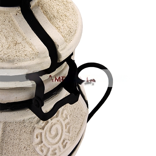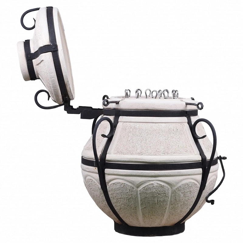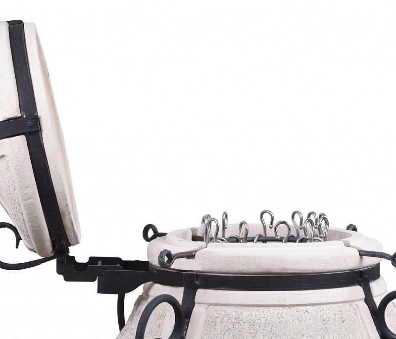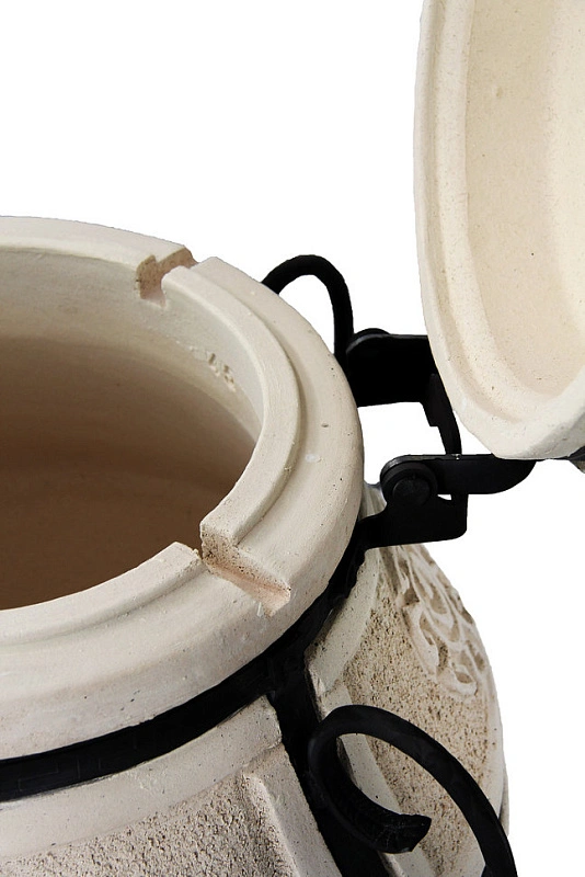 Для большей устойчивости модели и ее легкого перемещения предусмотрена кованая подставка с ручками. Прочная сталь легко выдерживает нагрузки, а благодаря изящному воплощению, подставка смотрится красиво и дополняет облик печи. За счет ручек переносной тандыр «Алладин мини» проще перемещать – идеальный дачный вариант.