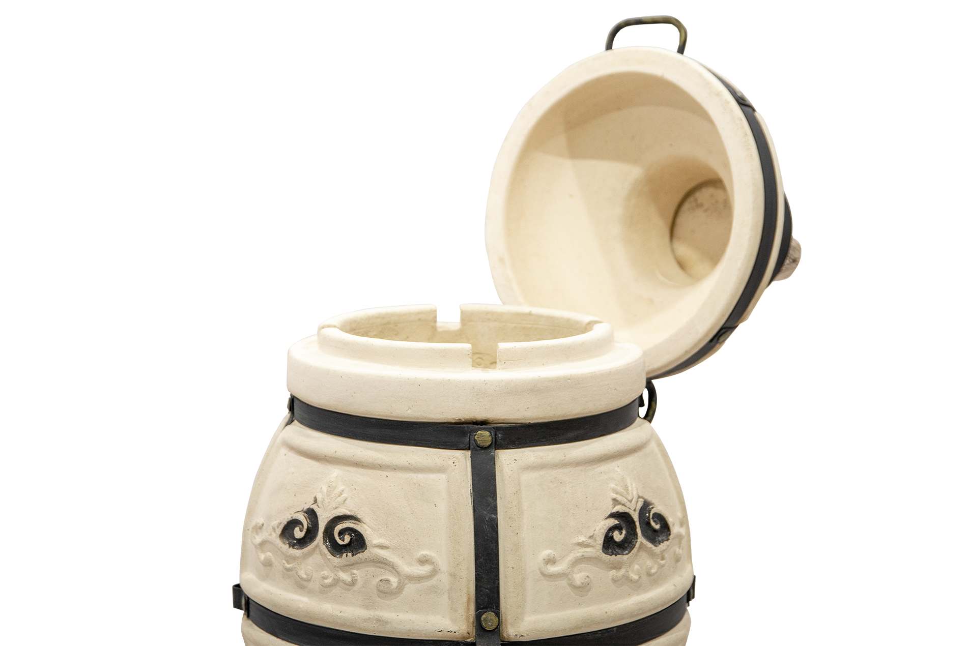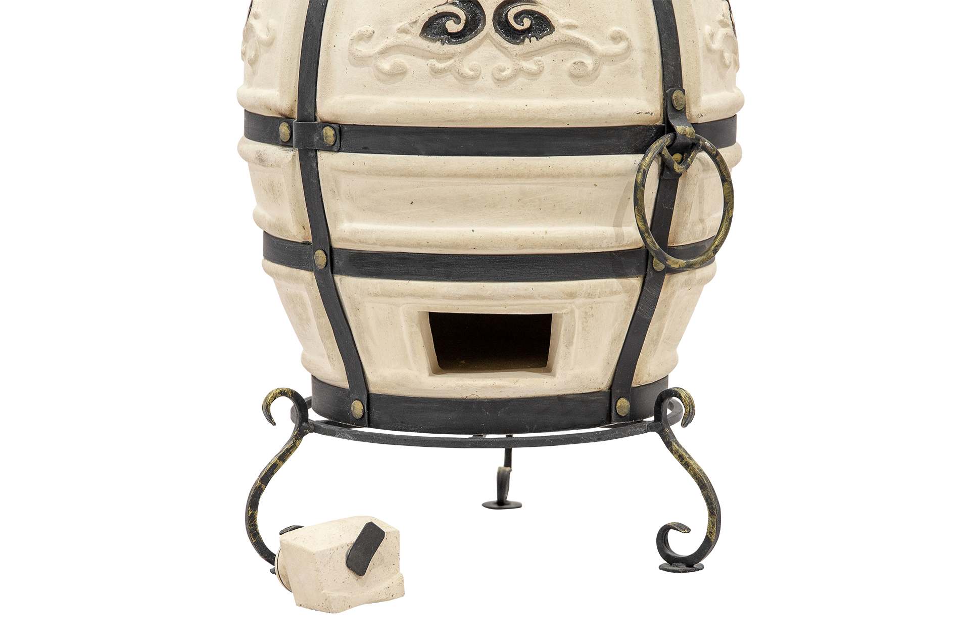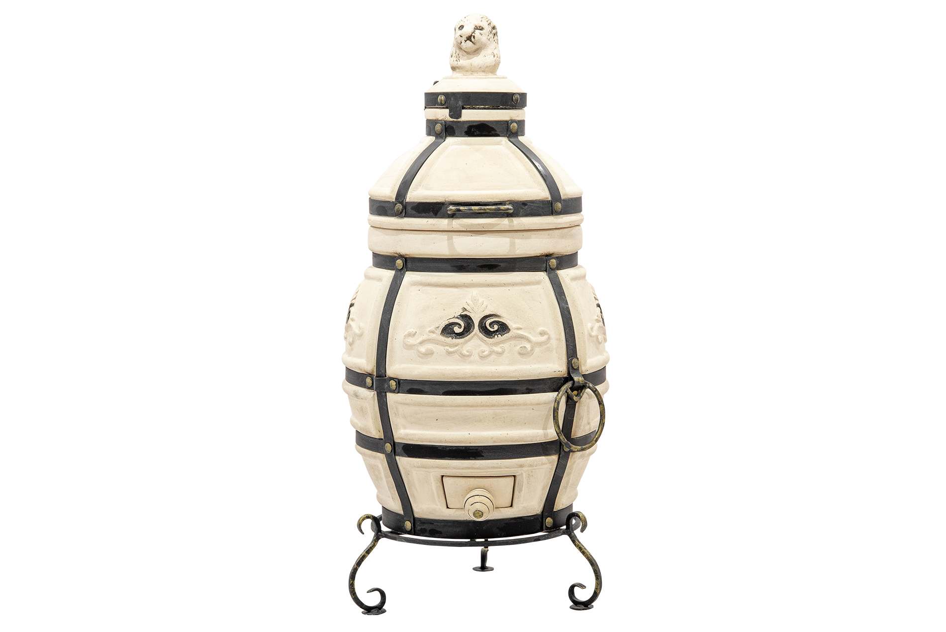 Тандыр выполнен в классическом светлом цвете с декоративными элементами в виде рельефных узоров, что придает ему изысканный и уникальный вид. Кованая подставка обеспечивает устойчивость и придает дополнительный стиль вашему участку.