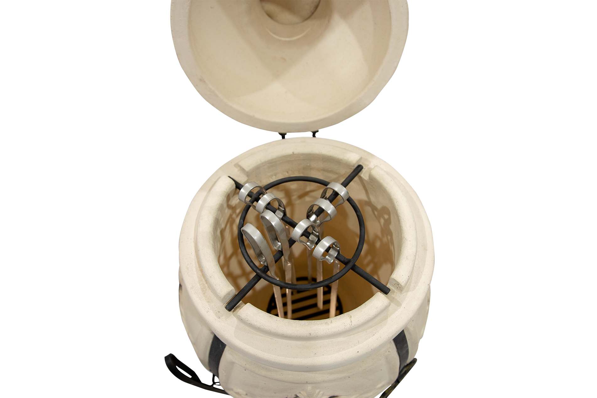 тандыр в сборе (1 шт.), кованая подставка под тандыр (1 шт.), шампуры из нержавеющей стали (8 шт.), совок (1 шт.), кочерга (1 шт.), зольная решетка (1 шт.), устройство для подвешивания (солнышко) (1 шт.) |