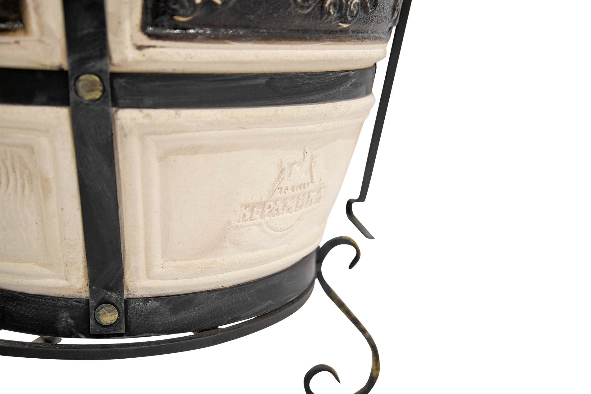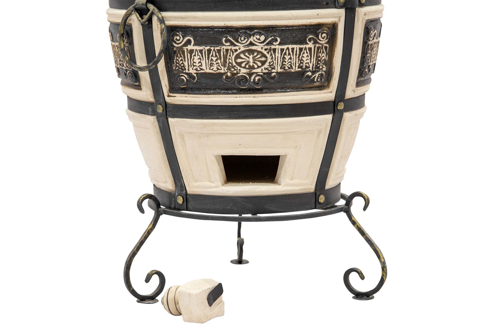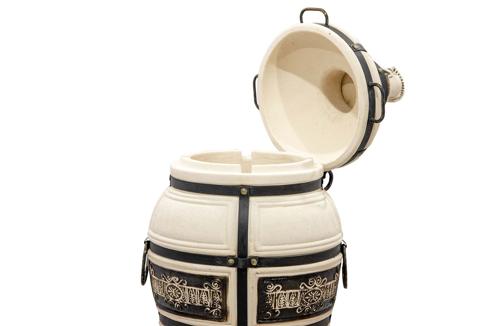 Тандыр Гектор украшен красивым орнаментом, выполненным в бежевых и коричневых тонах. Узоры нанесены с помощью глазури, которая защищает поверхность от влаги и грязи. Это не только делает тандыр эстетически привлекательным, но и обеспечивает долговечность внешнего покрытия. Изготовленный из шамотной глины, он устойчив к высоким температурам, обладает экологичностью и высокой прочностью. Срок службы этого тандыра превышает 10 лет.