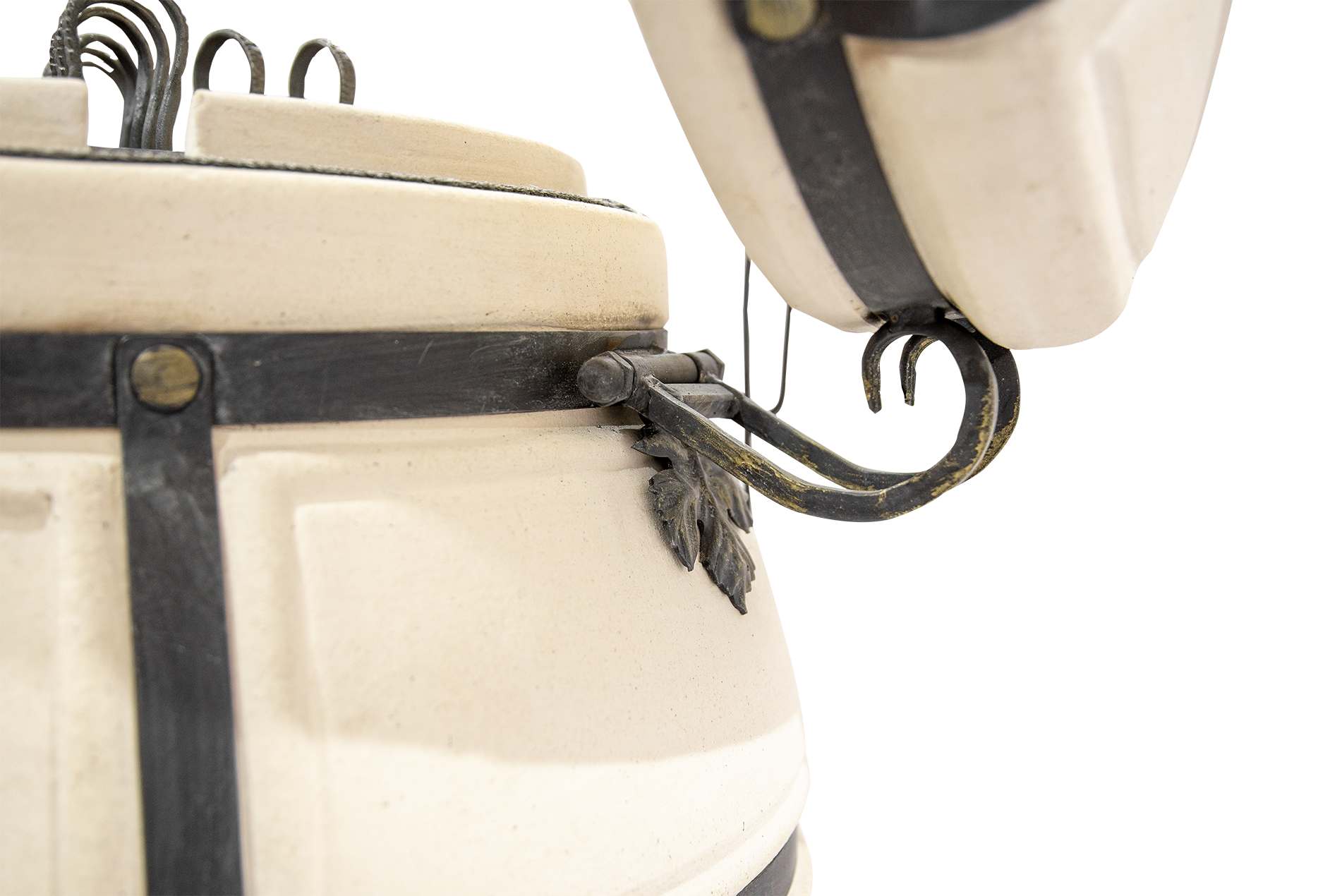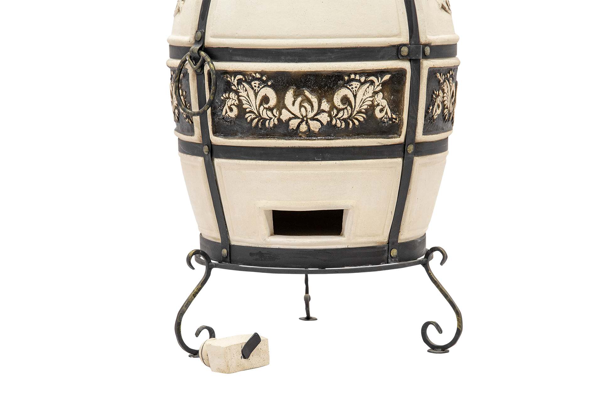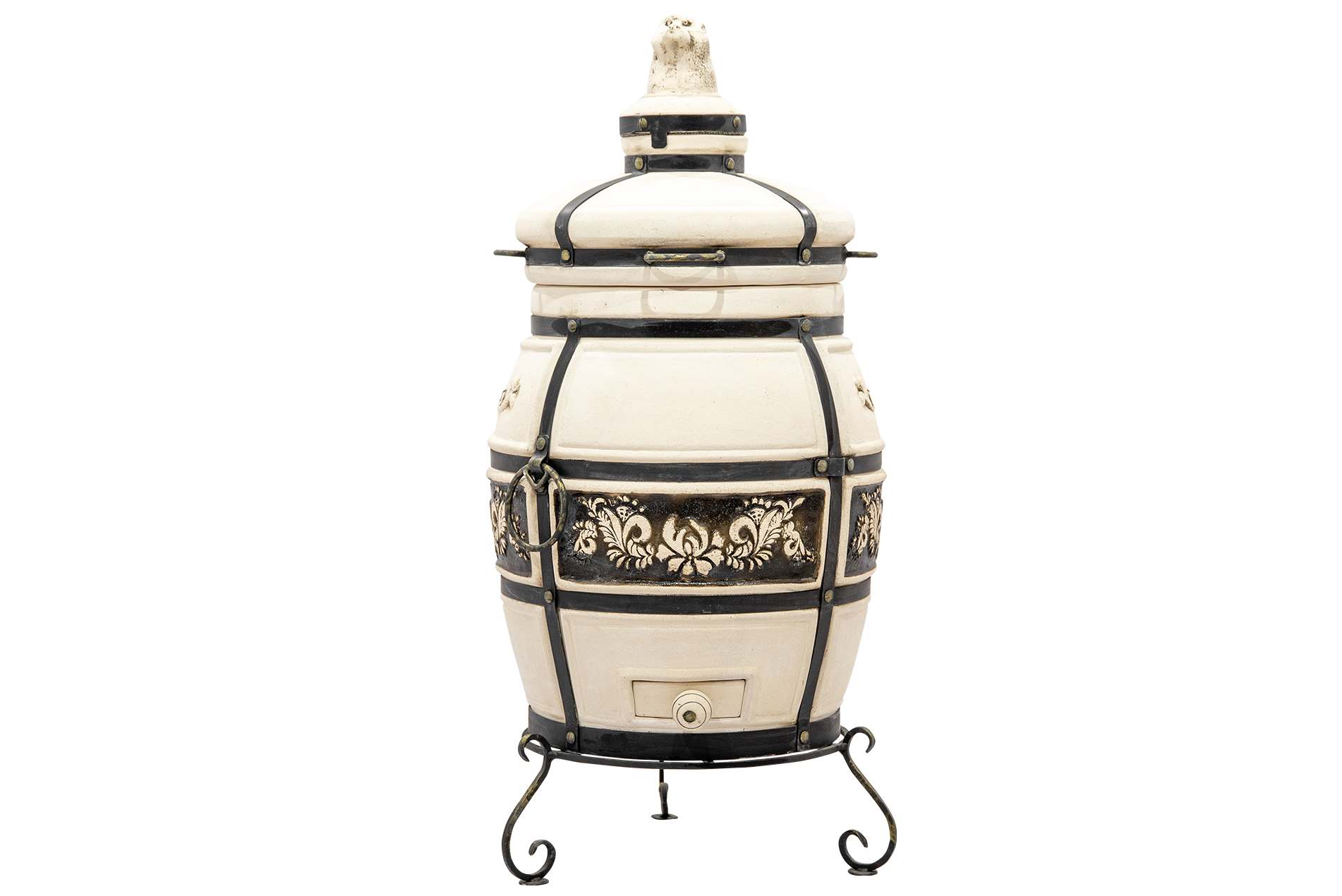 Эстетичный внешний вид тандыра Казачий украшен оригинальными орнаментальными узорами в бежево-коричневых тонах. На центральной части корпуса расположен декоративный элемент в виде растительного узора, выполненного с вниманием к деталям. Глазурь на орнаментах защищает поверхность от влаги и грязи, обеспечивая долговечность и эстетичный внешний вид. Шамотная глина, использованная в производстве, выдерживает высокие температуры и обеспечивает идеальные условия для готовки.