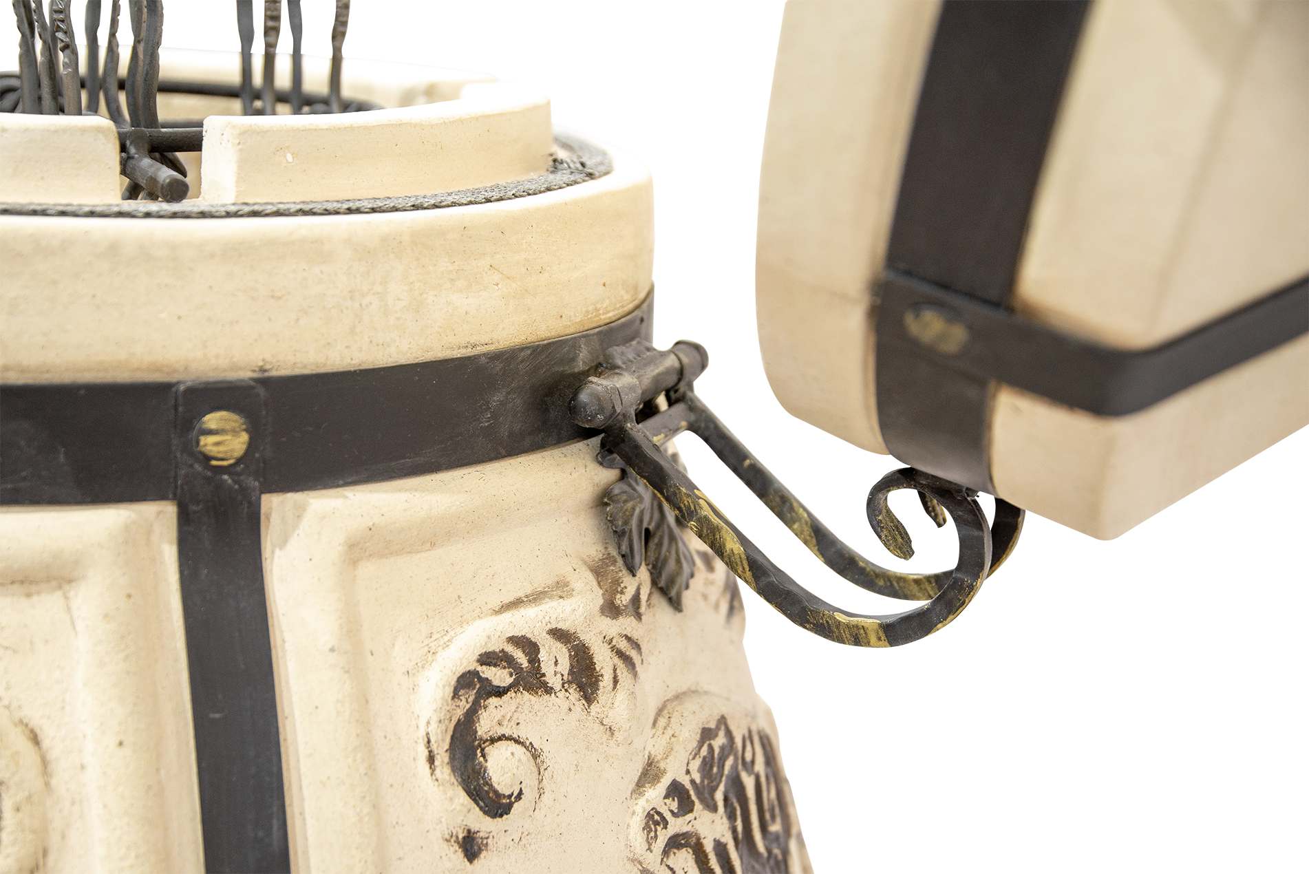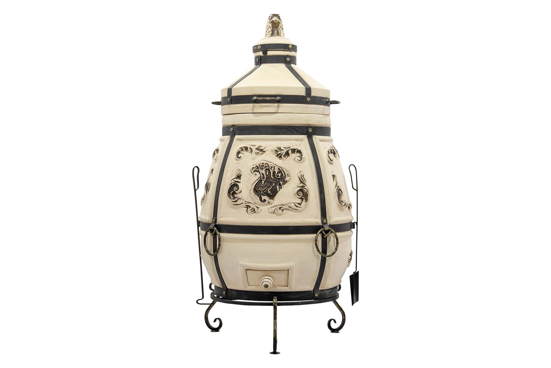 Тандыр Степной выполнен в форме классического глиняного горшка, слегка суженного к горловине. Уникальная деталь этого тандыра — декоративный колпачок в виде головы степного орла, символизирующего силу и свободу. Он не только придаёт тандыру особый шарм, но и помогает сохранять тепло при открывании. Основная откидная крышка с удобными ручками облегчает доступ к продуктам. Кованая подставка-ножки гарантирует устойчивость и удобство в использовании, а также не даст лишний влаге повредить дно тандыра.